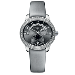 | 2. Ulysse Nardin Jade Jewellery White Gold 3100-125B/592: корпус из 18-каратного белого полированного золота, безель с бриллиантами круглой огранки общим весом 0,844 карата; графитовый циферблат, инкрустированный бриллиантами общим весом 0,332 карата; серый сатиновый ремешок с классической застёжкой из 18-каратного белого полированного золота. | |
